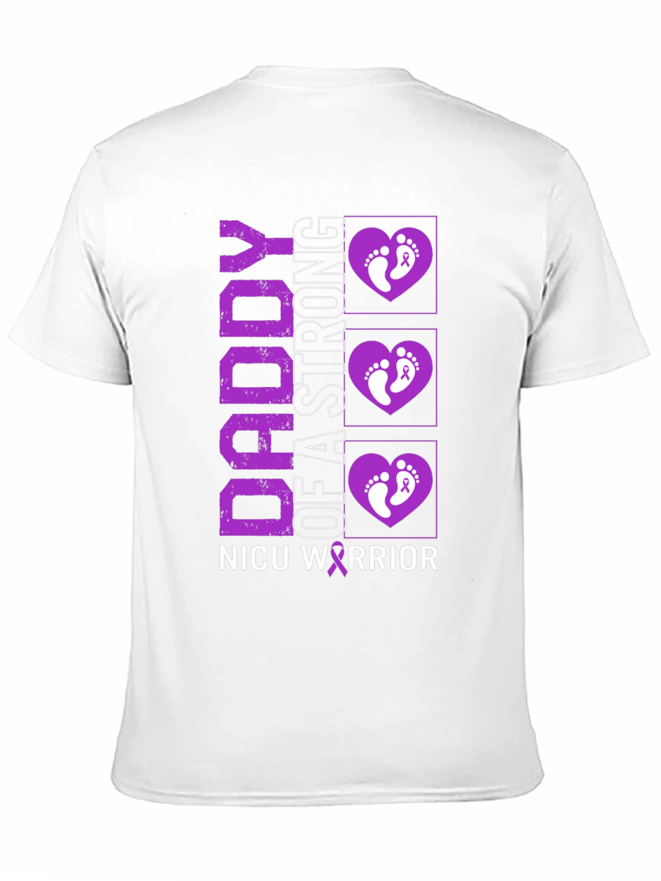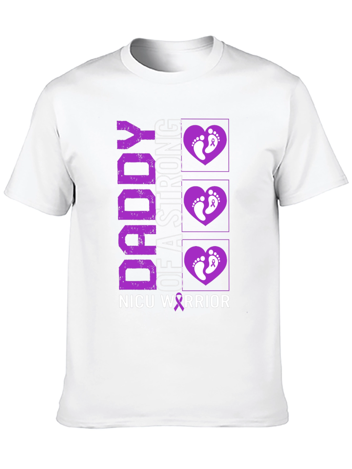 Show your pride and support with this NICU Warrior Dad T-shirt. Made from comfortable material, this black tee features a unique design with purple accents, including the words "Daddy of a Strong NICU Warrior" stacked vertically. The design also incorporates three purple hearts, each containing white footprints and a purple awareness ribbon. Perfect for raising awareness and celebrating your little warrior. This shirt is a stylish and meaningful way to show your support for NICU awareness.
